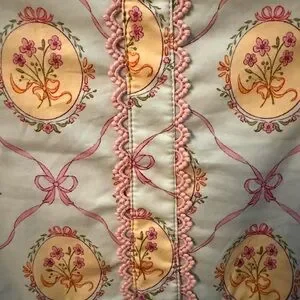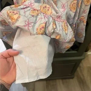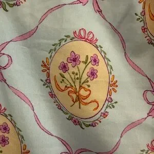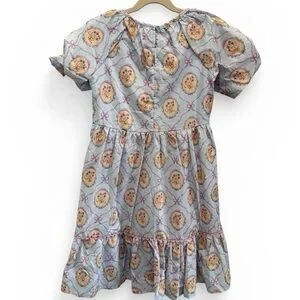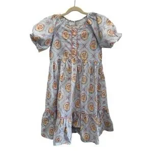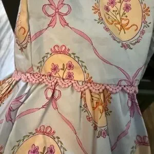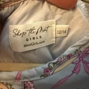 Shop the Mint Girls dress. Perfect for Easter! Light pastel blue base with pink ribbon and bow motifs. Small yellow-cream floral accents and green leaves. Feminine and playful print. Fits more like a 10/12 instead of 12/14. Measurements in picture. Never worn.