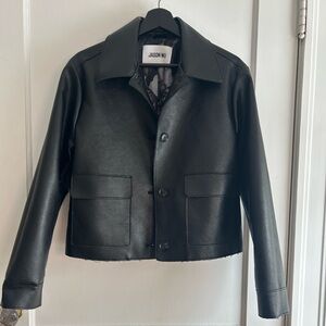Stylish black leather jacket by Jason Wu. Features a sleek design with front pockets and button closure.