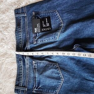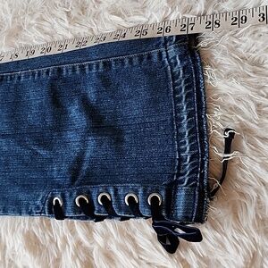 PAIGE vintage-inspired straight jeans in navy blue with lace-up side details. Comfortable High -rise fit with subtle distressed hem and classic five-pocket styling. Versatile blue denim for everyday wear. Straight Crop