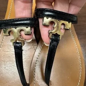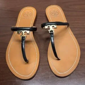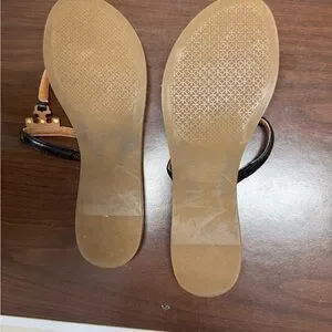 Tory Burch thong sandals featuring black leather straps and a gold logo accent. Smooth tan footbed with stitched detailing. Easy slip-on style for everyday wear. Perfect for summer. Very minimal wear.