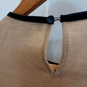 100% fine Italian Merino wool camel colored sweater with faux leather black trim. Keyhole back closure in good condition.