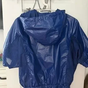 Glossy blue bomber jacket with hood. Lightweight and stylish. Ideal for casual wear.