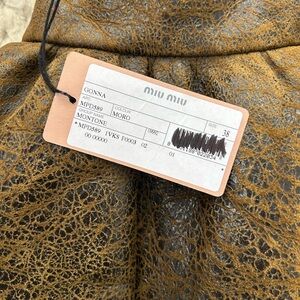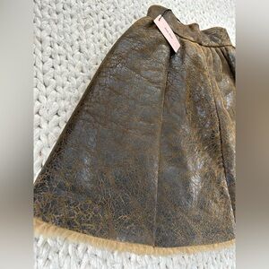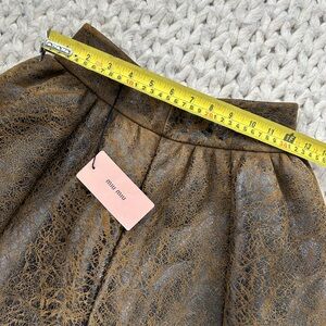 Designer Miu Miu full circle skirt with textured leather finish. Structured panels create gentle flare. Clean waistband for polished styling. Rich brown tone with subtle sheen. Inside is warm and fuzzy sheep skin. What a fun touch to this new with tags skirt.