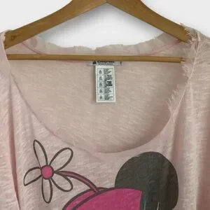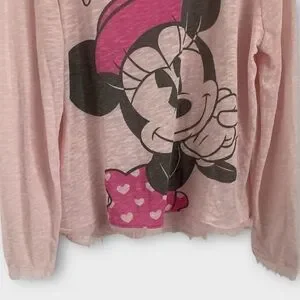 Super soft, semi-sheer Minnie Mouse graphic top in a bubblegum pink slub knit. Features a wide scoop neckline, raw frayed edges at hem and cuffs, and an oversized relaxed fit. Lightweight and playful — perfect for loungewear, layering, or your next Disney trip.