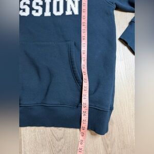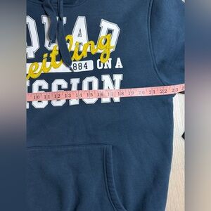 Breitling men hoodie in navy blue with bright yellow script logo and white block text. Hooded design with drawstrings and front kangaroo pocket. Comfortable crew-style fit for everyday wear.