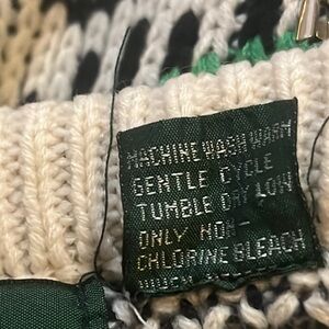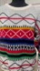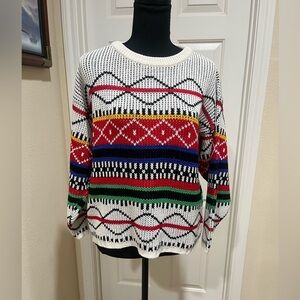 Stylish knit sweater with vibrant geometric patterns. Features red, blue, green, and black designs on a white background. COOGI INSPIRED, VINTAGE 80s to EARLY 90s PRE OWNED IN EXCELLENT CONDITION