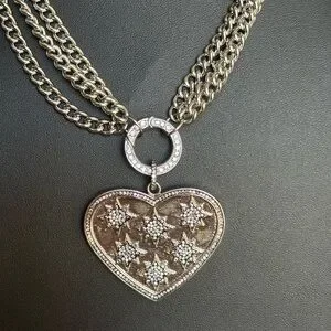 Elegant silver heart pendant necklace with sparkling star accents. Perfect for adding a touch of glamour to any outfit.