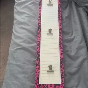 Long clipboard with pink and black design. Features three metal clips. Picture of the top is included
