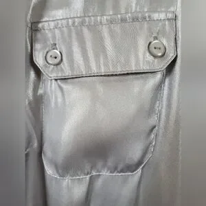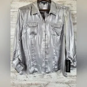 This NWT shimmering flowy top is a metallic button-front blouse from the brand Notations. It features a classic spread collar, two front chest patch pockets with button closures, and long sleeves that have tabs to button and roll up to convert to 3/4 length.