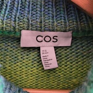 COS green ombre striped knit turtleneck sweater. Soft, cozy knit with tonal green and yellow stripes. Relaxed fit and ribbed collar for comfortable wear. balloon sleeve detail. OVERSIZED fit marked size XS but fits M/L. PTP 22 and has a lot of stretch/give.