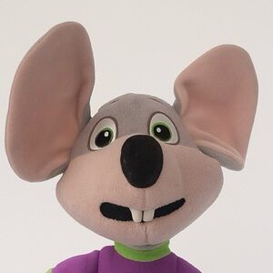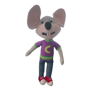 Bring home the fun with this adorable Chuck E. Cheese plush! This soft, cuddly character features his classic purple “C” T-shirt, denim-style pants, and red sneakers—perfect for fans of all ages.