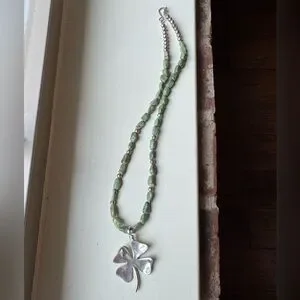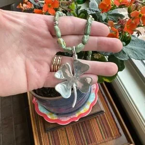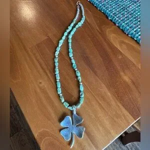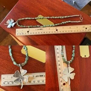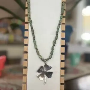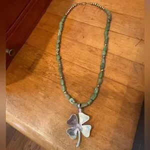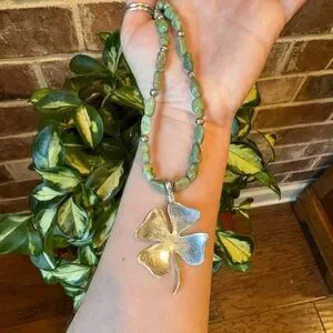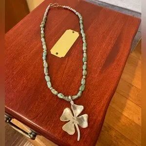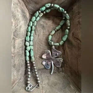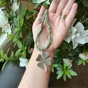 Vintage Sterling Silver Turquoise Necklace with Silver Beads and Removable Lucky Charm Shamrock Pendant. Pretty Green Turquoise Necklace measures about 20β long. Four Leaf Clover Pendant measures approximately 1 1/2β wide and 2 1/4β high. Unhallmarked but both pieces are Sterling Silver. Very good vintage condition.