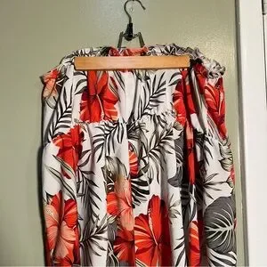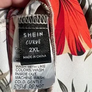 Great condition. Shein Curve. Strapless romper. White with orange and green tropical floral pattern. Ruffle detail. Plus size 2XL. 100% polyester. Pit to pit laying flat 16” Pit to hem 23.5” Inseam 4”. All measurements are approximate and taken lying flat. Smoke free home. No trades, offers welcome.