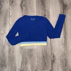 This Wilo the Label Ribbed Crop Top is a versatile piece of activewear that can be worn for a range of activities, including cycling, cross training, and yoga. The top features a round neckline, long sleeves, and a pullover closure for ease of wear. The blue and yellow striped pattern and contrasting trim add a stylish touch to this athletic fit garment.