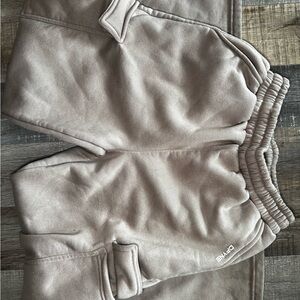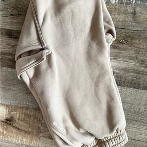 Comfortable beige track joggers designed for everyday wear. Soft fleece fabric and elastic cuffs for a secure fit. Subtle white logo detail near the hem for a minimalist look. Easy-to-style neutral color suitable for casual outfits.