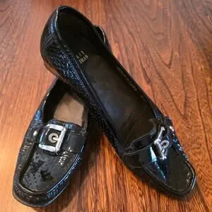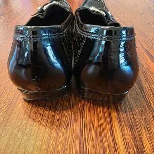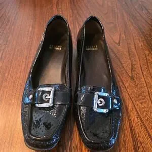 Stuart Weitzman timeless black patent leather Loafer Silver Buckle details 8.5