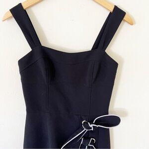 This update on a Rebecca Vallance classic has a fitted bodice with wider shoulder straps for comfort and eyelet and tie detail with piping in the skirt. Bonded crepe fabric molds over the body to create a slim, pencil silhouette and is completed with gold hardware for an added touch of bling.