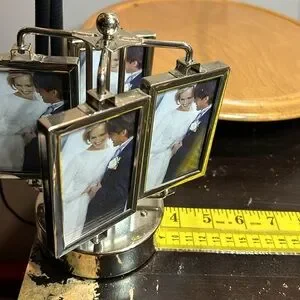 Elegant silver-tone rotating photo frame carousel. Displays multiple 2x3 photos in a polished silver finish. Sleek design adds classic style and easy photo viewing. Perfect for tabletop display and gifting.