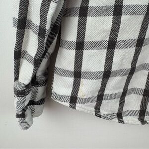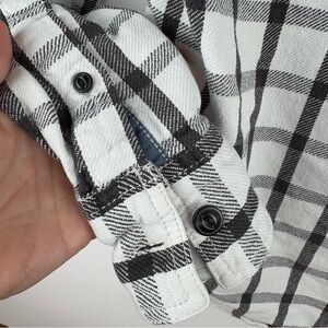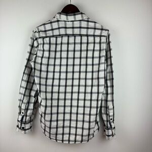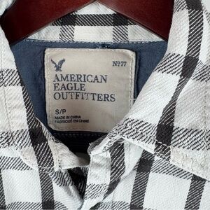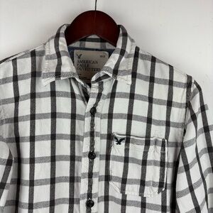 Casual button-down with a bold plaid design. Ideal for everyday wear. American Eagle Shirt Mens Small White Plaid Pocket Heavyweight Dad Button Up. Good used condition as it has a small spot and a tear on the back of the collar - please see pics for details.