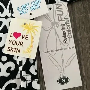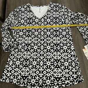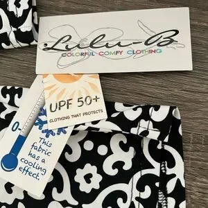 Brand new with tags Lulu-B three quarter sleeve cooling top in a black and white floral scroll print. Size Small. Features UPF 50 sun protection and cooling fabric designed to keep you comfortable in warm weather. Lightweight, stretchy, quick drying and super soft. Perfect for travel, walking, golf, beach days, outdoor activities or everyday wear. Flattering V-neck and easy relaxed fit.