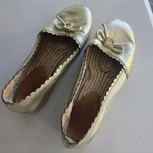 Step out in style with these chic gold espadrille flats. Featuring a charming bow accent, these shoes are perfect for any occasion.