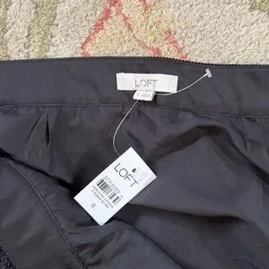 LOFT mini skirt in black with textured fabric. Button-front placket for subtle detail. Ruffle hem adds feminine movement. Versatile piece for multiple looks.