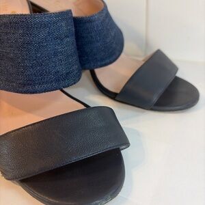 These slip-on designer heels offer a modern minimalist silhouette with the comfort of a sturdy block heel and elevated denim texture.