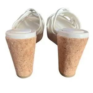 Open square toe Slip on Crossover toe straps Cork detailing at sole edge Logo hardware at toe 4.33" (110mm) wrapped wedge heel Leather/fabric/metal/plastic upper, leather lining, rubber sole.