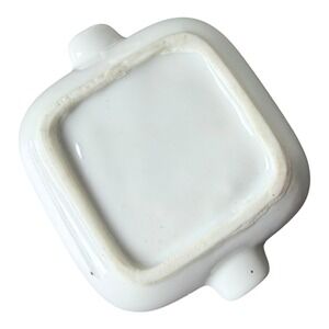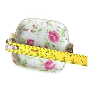 Vintage porcelain ashtray with a delicate pink rose floral pattern and gold-tone accents on the rests. This square-shaped piece features a romantic botanical design with green leaves and pink buds across a white base. Ideal for use as a trinket dish, ring holder, or decorative vanity accessory. Shows some light wear to the gold trim and interior surface consistent with age.