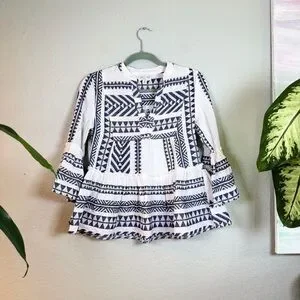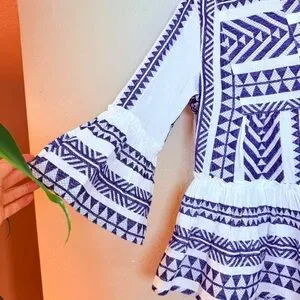 Jun & Ivy Cotton Mediterranean Blue White Notch V Neck Ruffle Hem Bohemian Top M