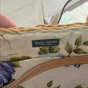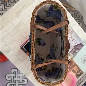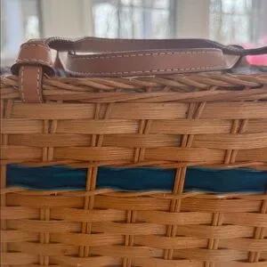 Woven wicker tote with teal ribbon accent. Leather handles and top trim. Structured basket silhouette. Casual and chic for everyday use, but perfect for Easter and Spring days!