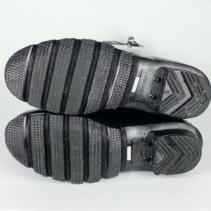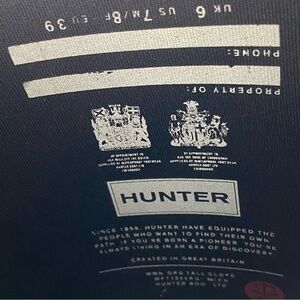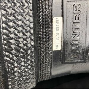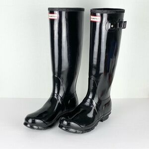 Hunter tall fully waterproof rain boots. Size: 8 Female, 7 Male. Color: Black Gloss. These boots have a high-shine rubber finish. Approximate measurements: 16” shaft height, 16” calf shaft circumference and 1” heel. They have traction soles, the iconic Hunter logo on the front and an adjustable side buckle detail.They are pre-loved, however, are in very good condition. Please zoom pictures: a slight scuff mark noted on both lower boots. Does not affect the wear or look of boots - as the scuff is on the inner side. Offers welcomed and very fast shipping.