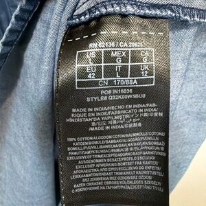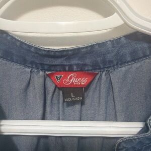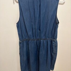 Sleeveless denim dress with V-neck and button-front detail. Elastic waist with drawstring for shape. Soft faded blue wash for casual style.