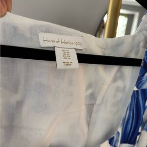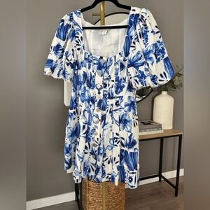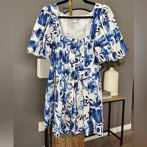 Effortlessly feminine and perfect for warm days, this beautiful House of Harlow dress features a fresh blue and white floral print that feels both classic and modern. Designed with a flattering square neckline and charming puff sleeves, the silhouette gently skims the body and falls to about knee length, creating an easy, romantic shape. The front button detailing adds a vintage-inspired touch while keeping the look polished and versatile.