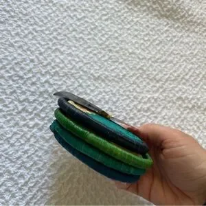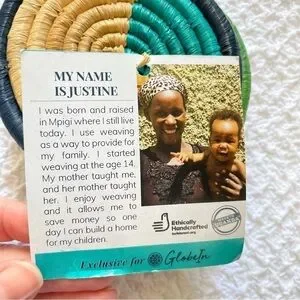 Features: rattan, ethically handcrafted, green, blue and teal.