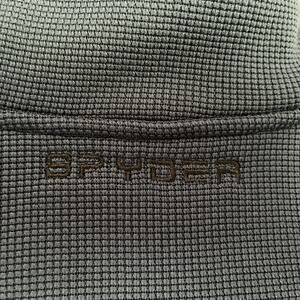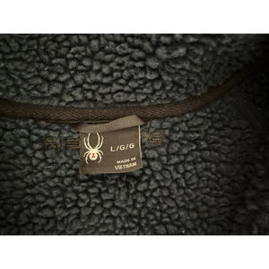 Men’s Spyder full zip fleece jacket in size Large (L/G). This versatile performance layer features a textured blue outer shell with contrasting black side panels and sleeves for a sleek, athletic look. The jacket has a full front zipper, two zippered hand pockets, and the signature Spyder logo embroidered on the chest and back collar.