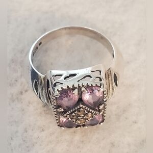 .925 Sterling Silver Amethyst & Marcacite Ring featuring four faceted purple gemstones in a vintage-inspired rectangular setting. Sparkling marcasite accents add refined detail. Size 7