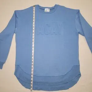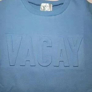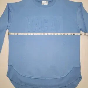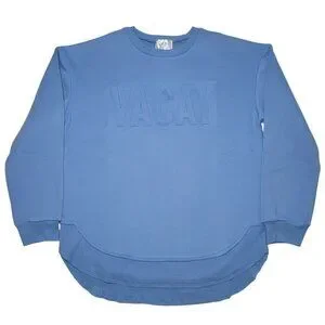 Features: Embossed “VACAY” lettering Crew neckline Long sleeves with ribbed cuffs High-low rounded hem Super soft, medium-weight fabric Relaxed fit