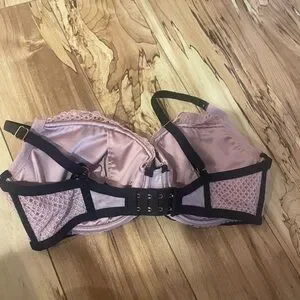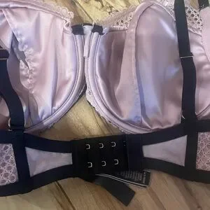 Supportive push-up bra with shimmering pink lace overlay. Soft molded cups lift and shape. Adjustable black straps and underband for a secure fit. Scalloped lace edge adds feminine detail. This bra has shimmer that I can capture in the photos all over the pink.
