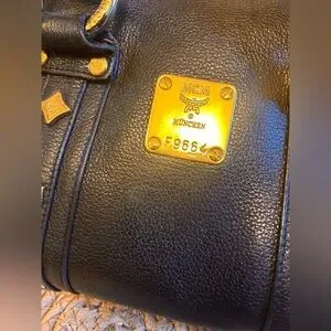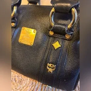 Elegant black satchel by MCM. Features gold accents and sturdy handles. Perfect for any occasion.