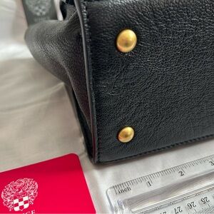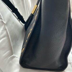 Gold-tone stud accents line the front. Detachable leather tassel with branded plaque. Structured silhouette with top handles and optional strap. Polished hardware for a refined look.