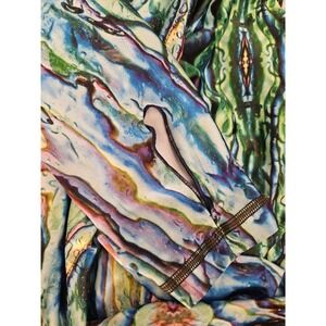 Slippins long sleeve skinsuit features a vibrant, multi-colored abstract pattern reminiscent of abalone shell or marble textures. Designed for aquatic activities or as a bold statement piece, this full-body suit includes a front zipper for easy wear and thumbholes at the cuffs to keep sleeves securely in place. The lightweight, stretchy fabric provides a sleek, second-skin fit that is both functional and eye-catching.