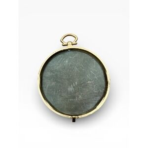 This retro hanging frame set features four small round linked frames designed to display miniature photos or artwork vertically as a decorative chain. The frames are made from molded plastic with a faux brass / gold tone finish, a common style produced in Hong Kong during the mid-century era (1950s–1970s).
