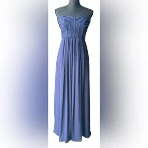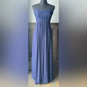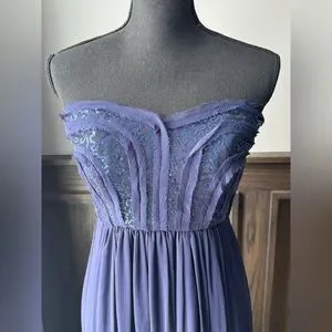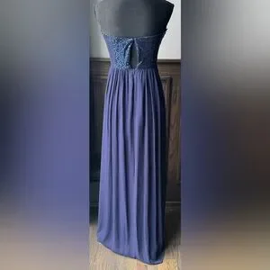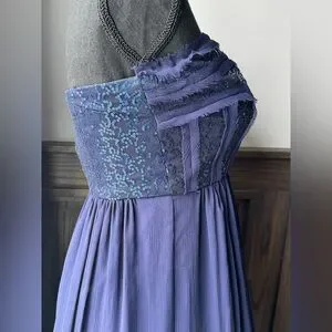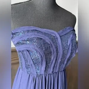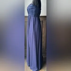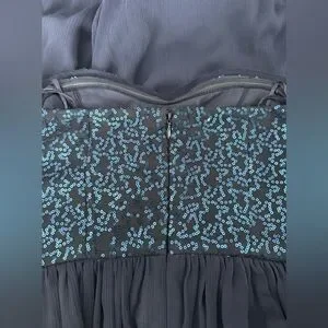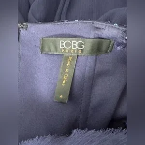 This BCBG Paris dress is gorgeous. It is a size 4. The back does zip all the way up. My mannequin was just too big. There’s a photograph of the back zipping up all the way. Navy blue with sequence just a stunning dress.