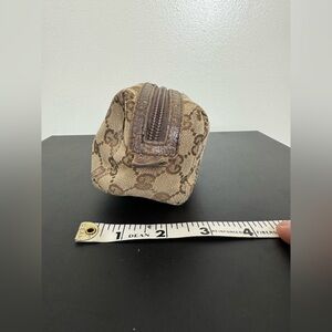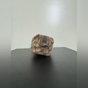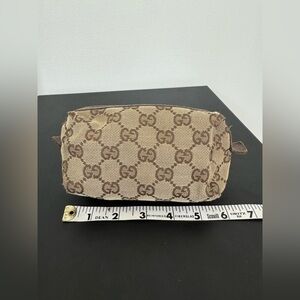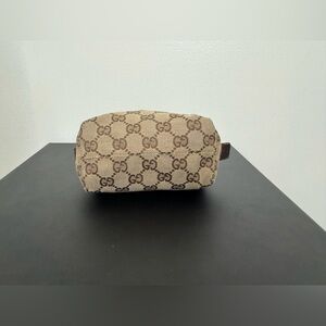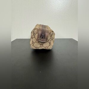 Compact Gucci pouch in signature monogram canvas. Top zip closure and structured shape. Classic neutral tones for versatile use.