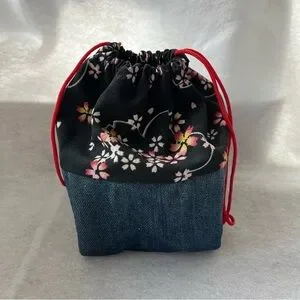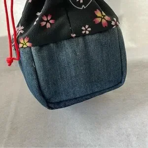 CHERRY BLOSSOM Drawstring Cosmetic Bag Denim Blue Pink Sakura