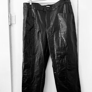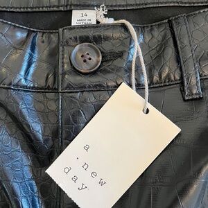 A new day high-rise, straight leg faux leather pants in black. Size 14. Classic design featuring 5 pockets and belt loops. Croc texture. Sleek and modern silhouette. Edgy styling with everyday comfort!