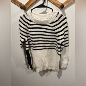 with navy blue stripes on a white background, featuring a crew neck and side zippers