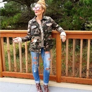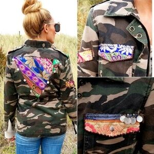 Beautiful Stories Embellished Patch Mixed Media Camouflage Utility Jacket". It is a camouflage-patterned jacket with several pockets, each adorned with different colorful fabric patches. Waist can be cinched.