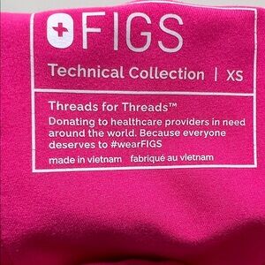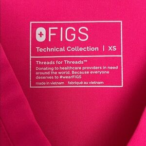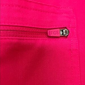 Two-piece women's scrub set from Figs in rare Shocking Pink. V-neck top with chest pocket and straight leg pant., both size Small. Tiny black ink stain as shown in pic, inner left upper leg area.